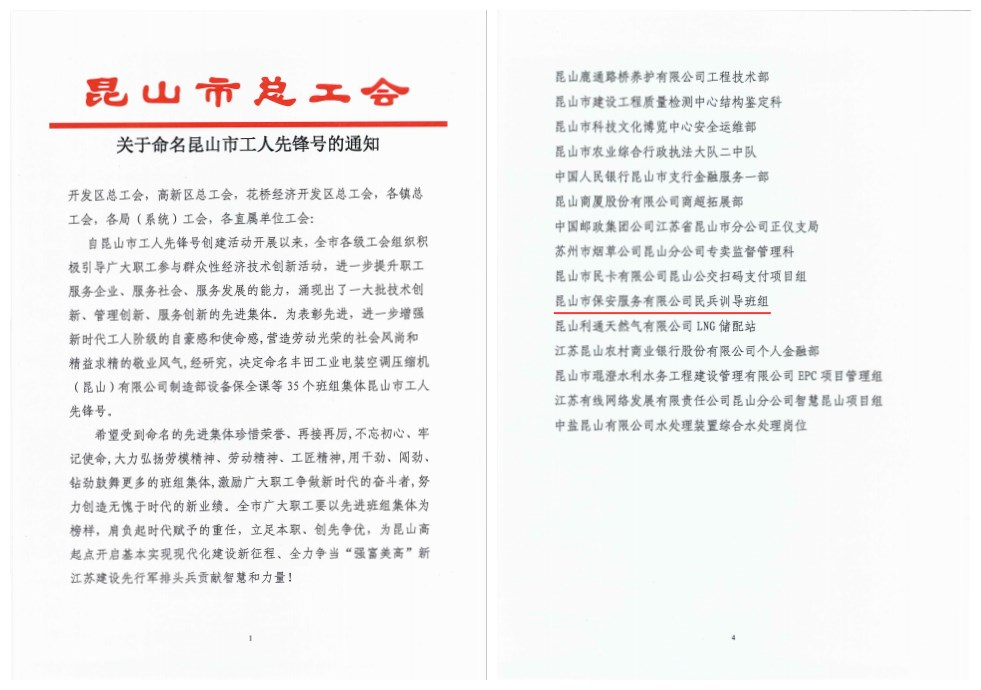 近日,昆山市總工會表彰了一批“工人先鋒號”班組集體,其中昆山市保安服務有限公司民兵訓導班組被授予昆山市“工人先鋒號”榮譽稱號。
