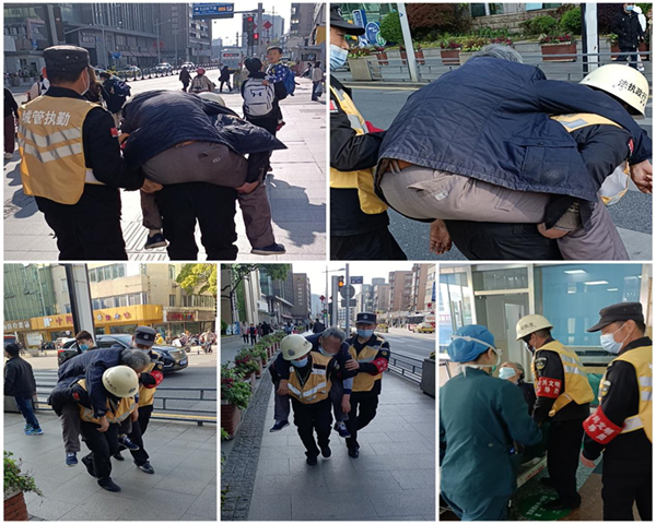 4月9日15:50分左右,安保公司柏廬城管中隊保安員紀冬林在采蓮街開展巡邏工作時,發現一名白發蒼蒼的老人暈倒在地,他立即與另外兩名隊員將老人送往人民醫院救治,經過搶救成功脫離生命危險。