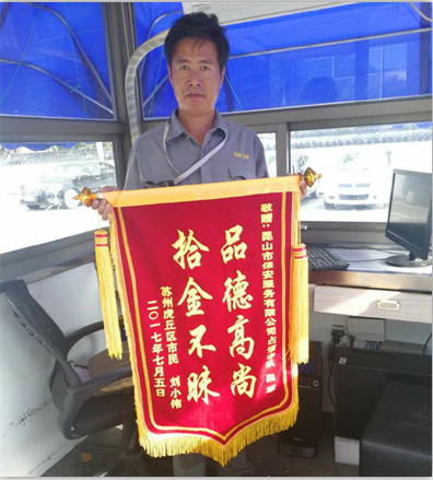 近日,保安公司停車收費中隊收到一面市民贈送的錦旗,原來是7月4日下午,停車收費員呂軍在中山路停車場巡視時,在崗亭附近撿到一只黑白混色背包,發現包內有多件電子產品及重要證件,隨后呂軍立即向110指揮中心報告了情況,后通過警方的幫助找到了失主,失主為了表達感激之情,特贈送了一面致謝錦旗。