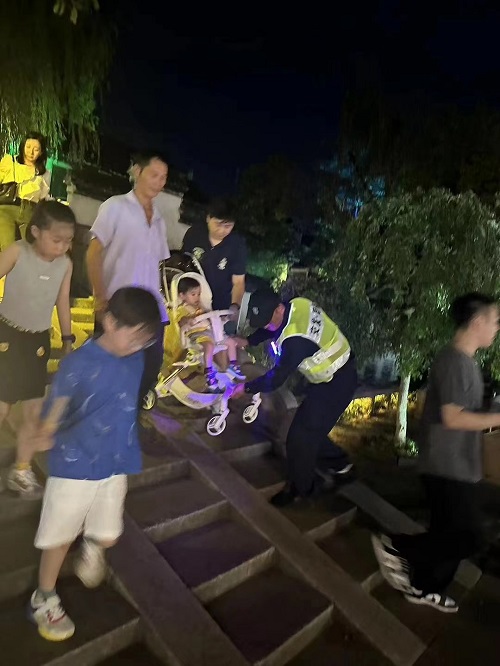 10月7日晚上19點左右,在周莊古鎮內一名游客獨自帶著小朋友從周莊古鎮景區出來,在下青龍橋的時候,由于兒童推車有點不好推下去,為保護兒童安全,游客走的小心翼翼,安保公司下屬保安員發現后立即上前幫忙一起把兒童推車抬到平地上。